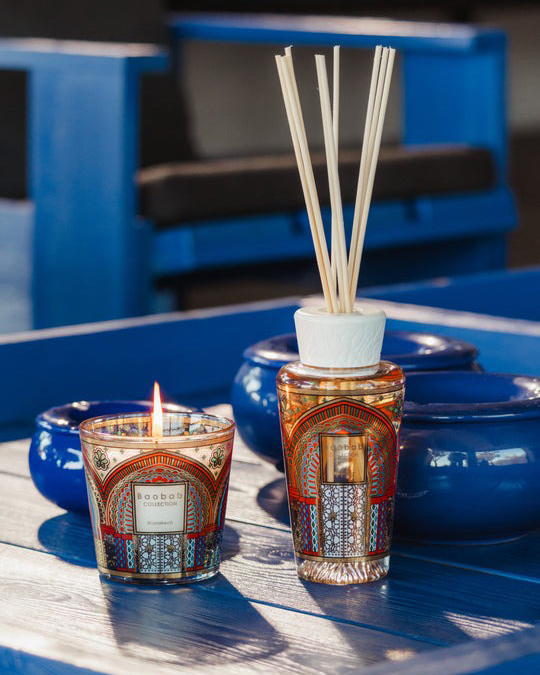 Ce coffret réunit deux objets parfumés d’exception : une bougie et un diffuseur de la collection My First Baobab Marrakech. L’ensemble est enveloppé d’un univers visuel inspiré des portes de la Médina, avec un motif sérigraphié vibrant mêlant art décoratif marocain et savoir‑faire artisanal.