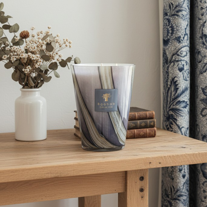 Bougie Baobab Woods Brocéliande (MAX 10) : parfum aromatique mêlant elemi, vetiver et mousse. Verre soufflé à lignes verticales, tons gris-lavande, 4 mèches. Un parfum boisé, enveloppant, idéal pour une ambiance sereine. Disponible à partir de 105 €.