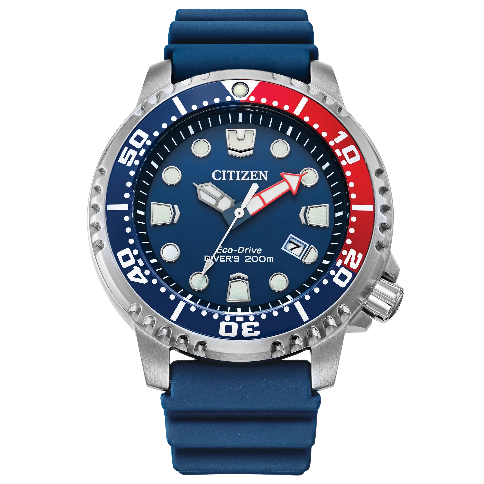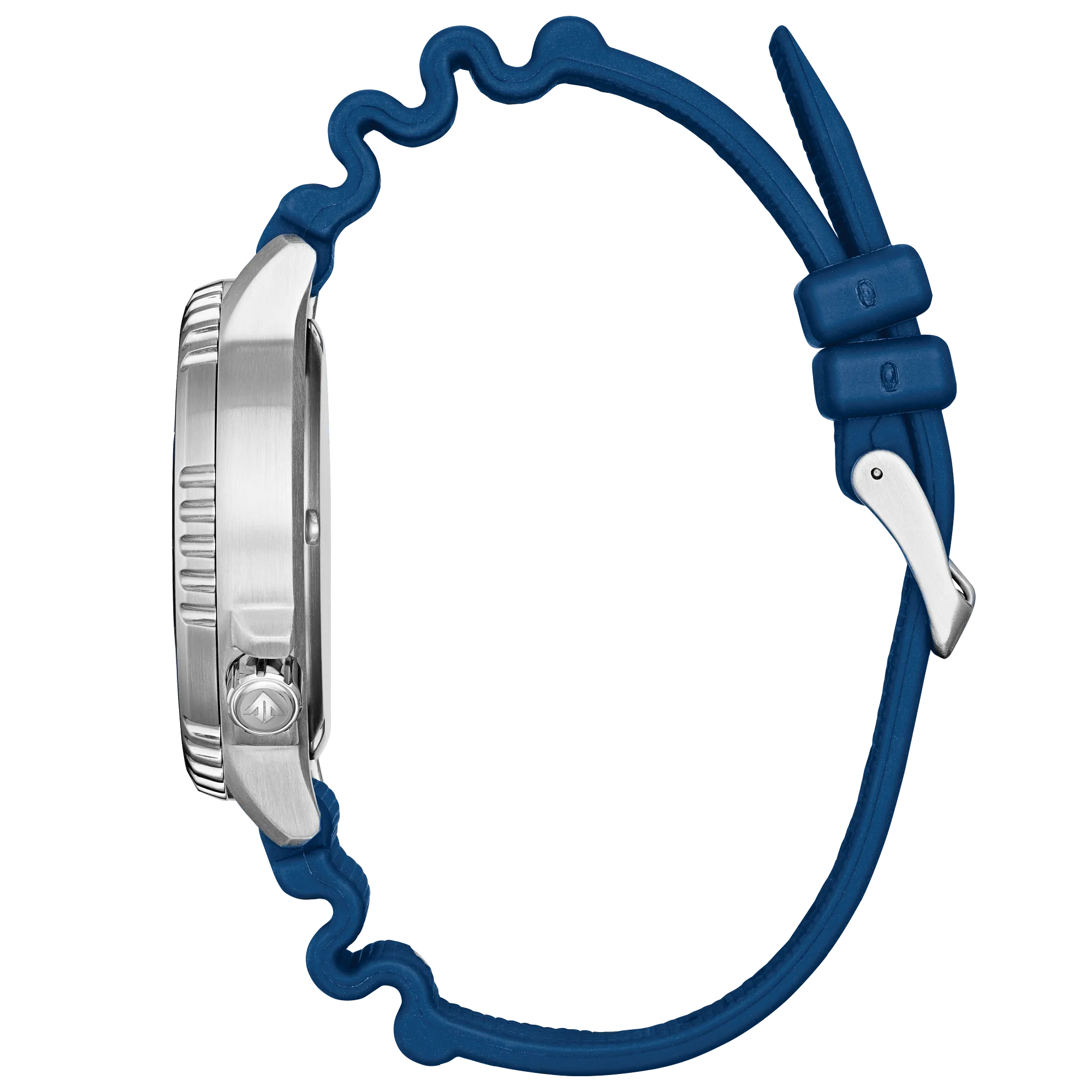 Son boîtier en acier inoxydable de 44 mm s’accompagne d’un cadran bleu profond doté d’index et d’aiguilles luminescents pour une excellente lisibilité même dans l’obscurité. La montre est montée sur un bracelet caoutchouc bleu confortable avec boucle ardillon. Elle affiche l’heure et la date avec précision, tout en offrant une grande fiabilité dans des conditions variées.