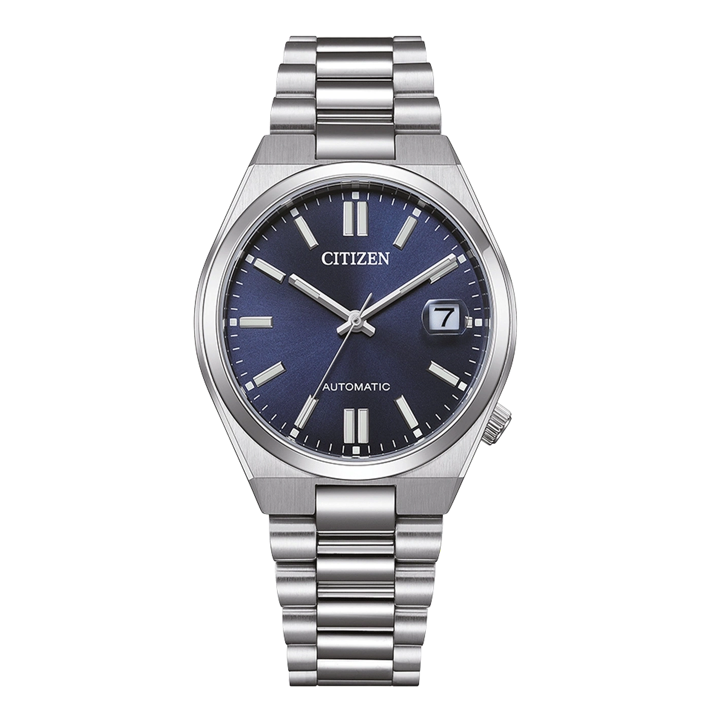 Citizen TSUYOSA NJ0200-50M : montre automatique en acier inoxydable avec boîtier 37 mm, cadran gris bleu, verre saphir et loupe sur la date. Calibre 8210, 42 heures de réserve de marche, aiguilles et index luminescents, fond en verre vissé et étanchéité 5 ATM.
