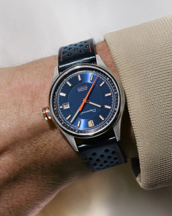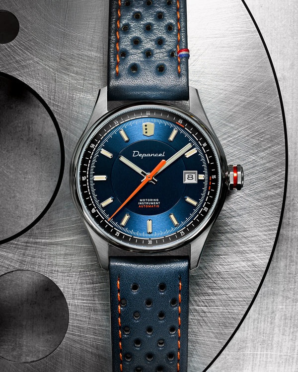 La Depancel Autosport Date Blue WA01AACO.MCENN1A associe un boîtier en acier 316L de 39 mm, un cadran bleu lisible avec Super-LumiNova Old Radium et un verre saphir double dôme. Animée par le mouvement automatique Miyota 9015 avec 42 heures de réserve de marche et un guichet à date, elle offre une étanchéité de 5 ATM et un bracelet cuir Racing Black Blue au style inspiré du sport automobile.