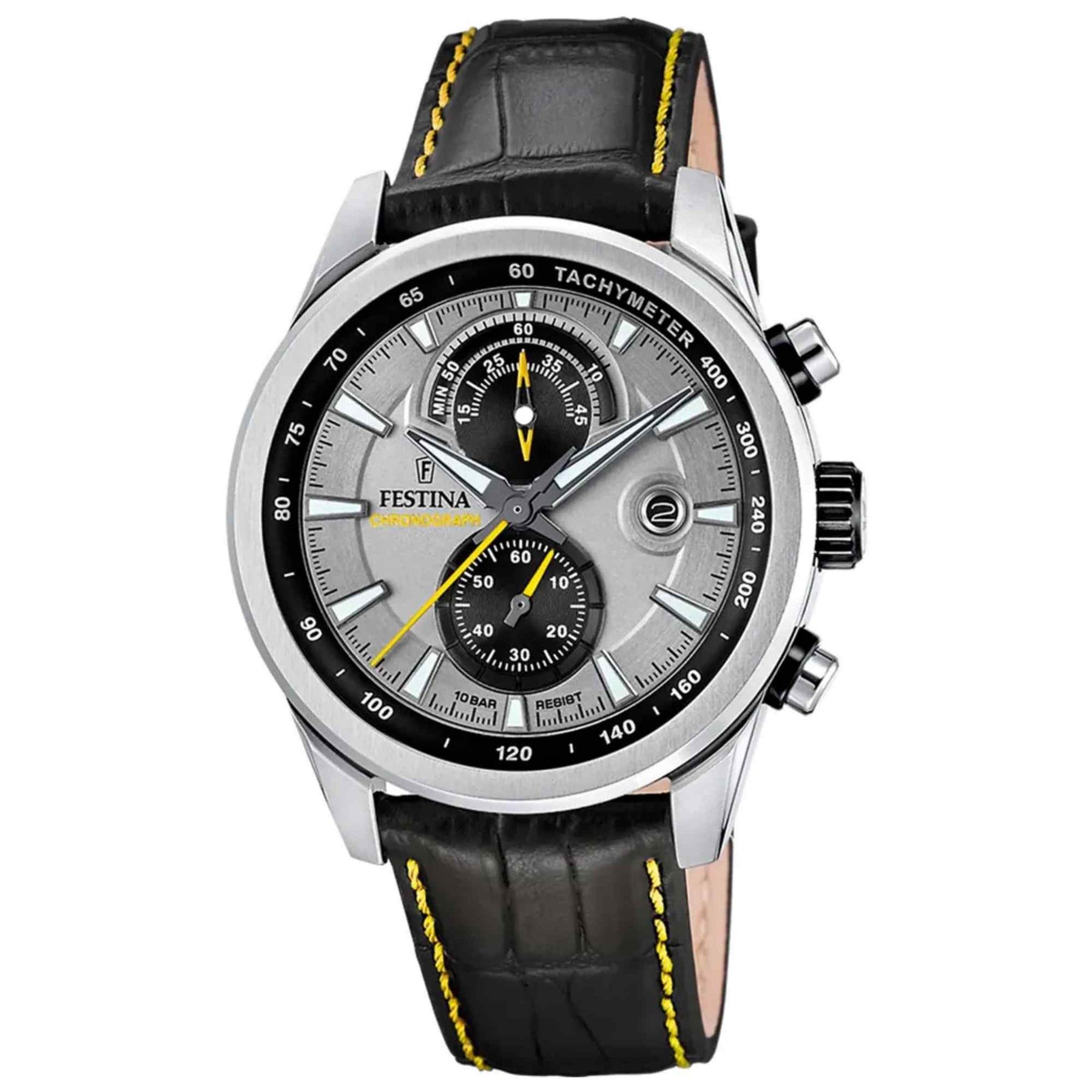 Festina présente la F20695/4, une montre chronographe pour homme au caractère affirmé alliant performance et élégance. Son boîtier en acier inoxydable de 44 mm de diamètre (≈ 11,45 mm d’épaisseur) abrite un cadran gris soigneusement travaillé, protégé par un verre minéral. Les aiguilles et index luminescents assurent une lisibilité optimale même en condition de faible luminosité.