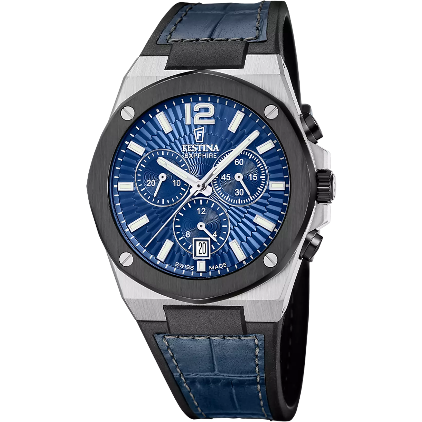 Festina Vallée F22001/4 : montre homme alliant design sportif et précision, avec boîtier acier 42 mm, verre saphir, mouvement quartz Ronda 715, étanchéité 100 m et bracelet en silicone.