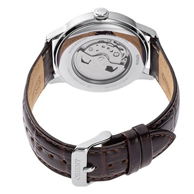 Le mouvement automatique Orient F6B24, visible à travers le fond transparent, propose un remontage manuel, un arrêt des secondes lors du réglage et une réserve de marche de 40 heures. Le tout est monté sur un bracelet en cuir brun de 21 mm à système de changement rapide, pour un confort optimal et un style adaptable.